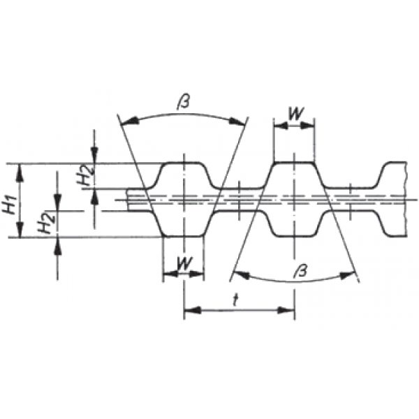 ПРОФИЛЬ | Шаг P (мм) | Шаг P (дюйм) | Высота ремня H1 (мм) | Высота зуба H2 (мм) | Ширина вершины зуба W (мм) | Угол профиля зуба ° | |