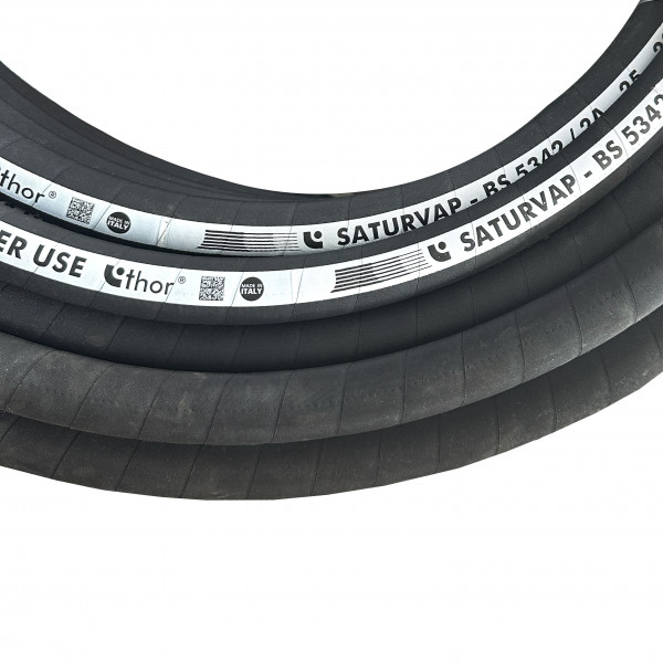 Рукав напірний 38х52 SATURVAP THOR (Italy) для гарячої води та насиченої пари до +210°C і піками перегрітої пари до +232°C. Робочий тиск 18 бар. Відповідає стандарту якості BS 5342-2A. Чорна гладка електропровідна гума EPDM, міцний сталевий корд. Запас міцності: 4:1